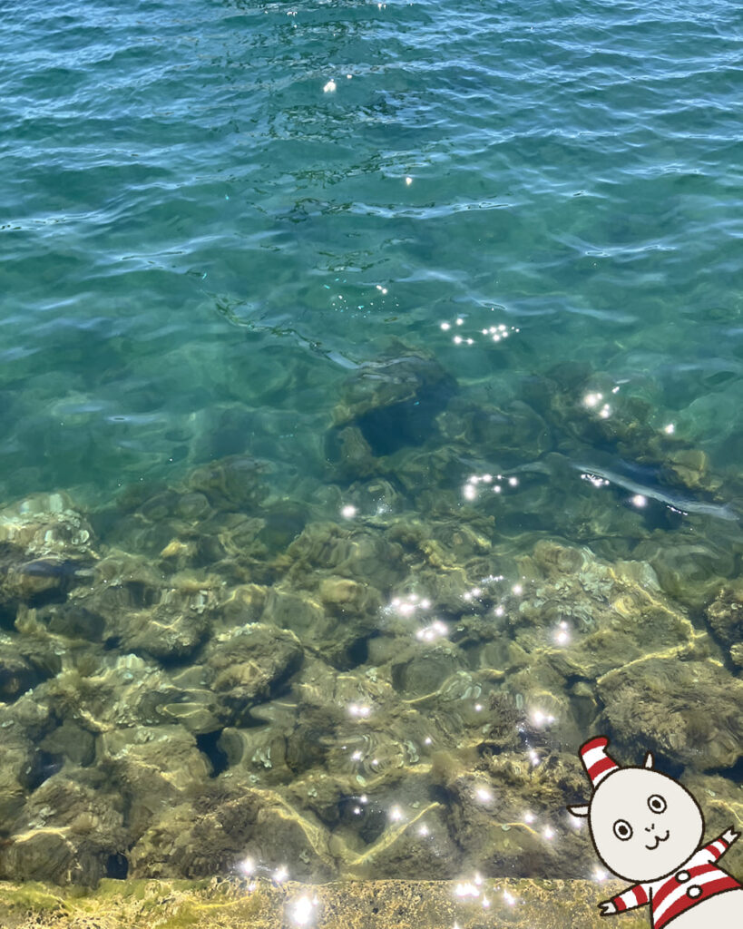 ボラ待ち櫓の大きさに「おおお…!」としばらくぼんやり見ていましたが、ふと下を見ると海のきれいさに驚きました。海面がキラキラ光っていてエモいし、なによりこの海の透明度!!!!!めちゃくちゃきれいなんだから!