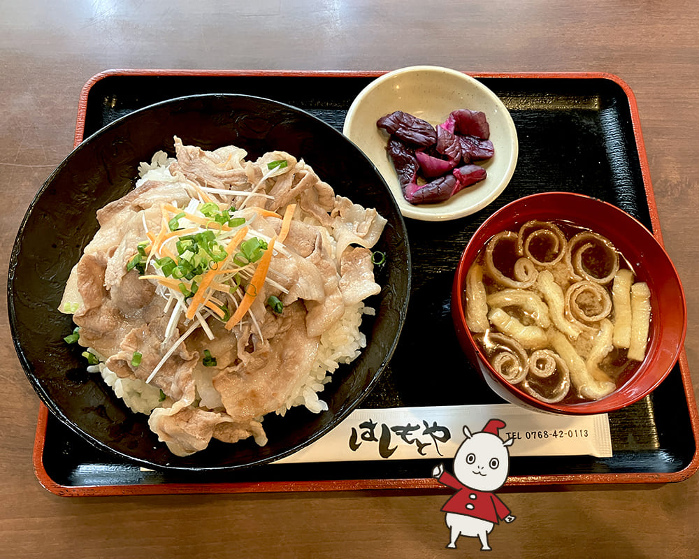 能登特産の豚肉「αのめぐみ」を、能登のいしりと珠洲の天然塩で焼き上げた丼です。まさに能登づくし♪